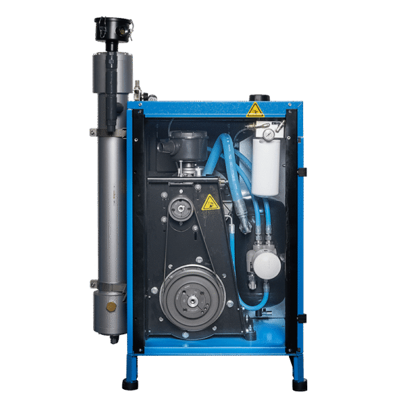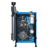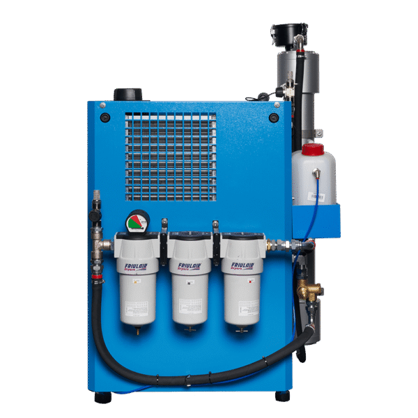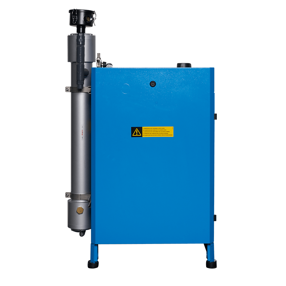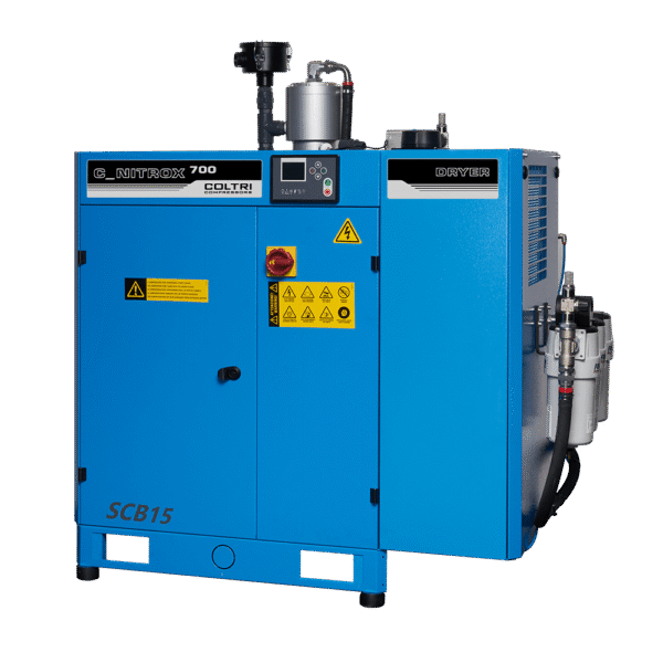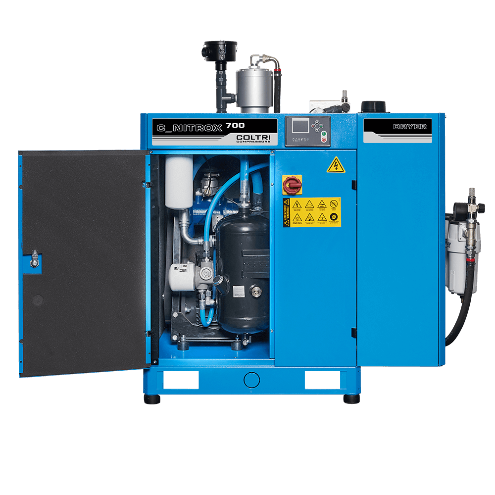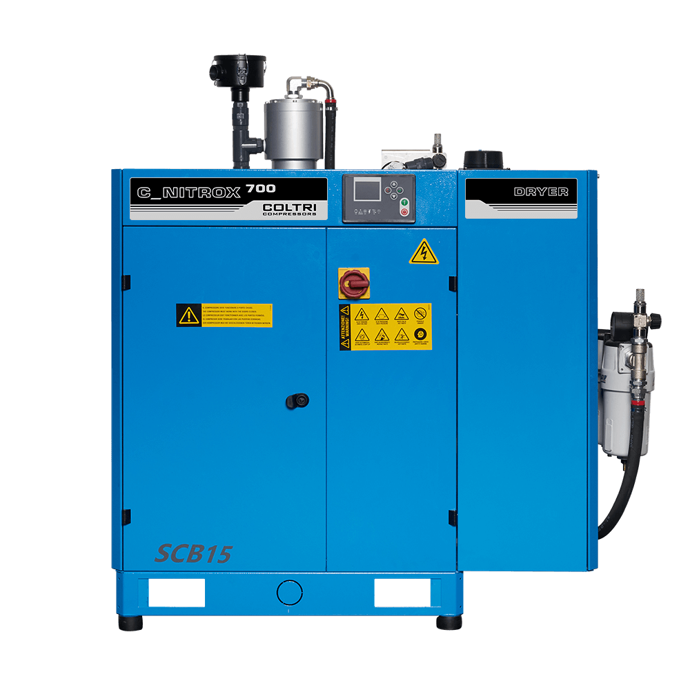 Industrial screw compressor that delivers air at a pressure of 10 bar to an OXYSEP 7-15-40 OXYGEN membrane that separates nitrogen and oxygen up to a maximum of 40 percent oxygen.