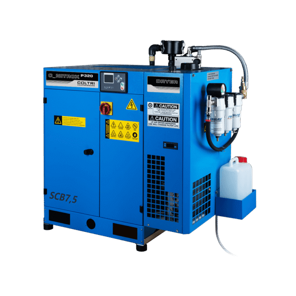Industrial screw compressor that delivers air at a pressure of 10 bar to a Parker membrane that separates nitrogen and oxygen to a maximum of 40 percent oxygen.