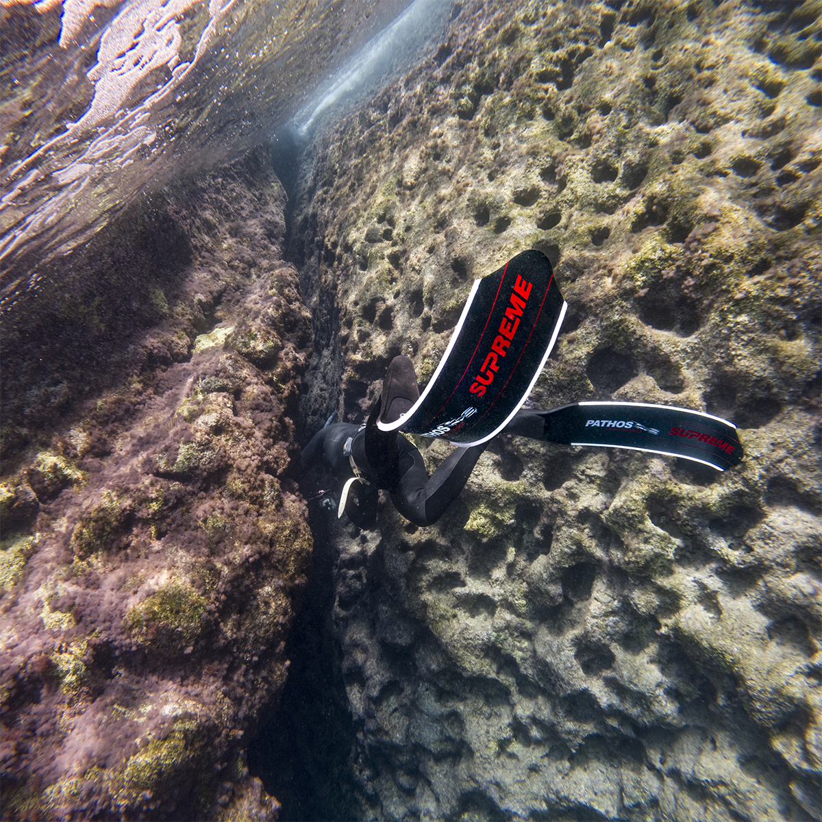 The best fins’ performance is achieved by increasing the blade’s angle and this requires a well-trained diver who constantly exercises and keeps up his/her fitness. The 33o angle comforts very experienced divers who keeps up their fitness condition and brings up the perfect results. The diver feels the superiority of the SUPREME swimming long distances and at free-fall planning in deep dives. The SUPREME blades combined with PATHOS footpocket give more dynamic results.